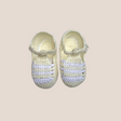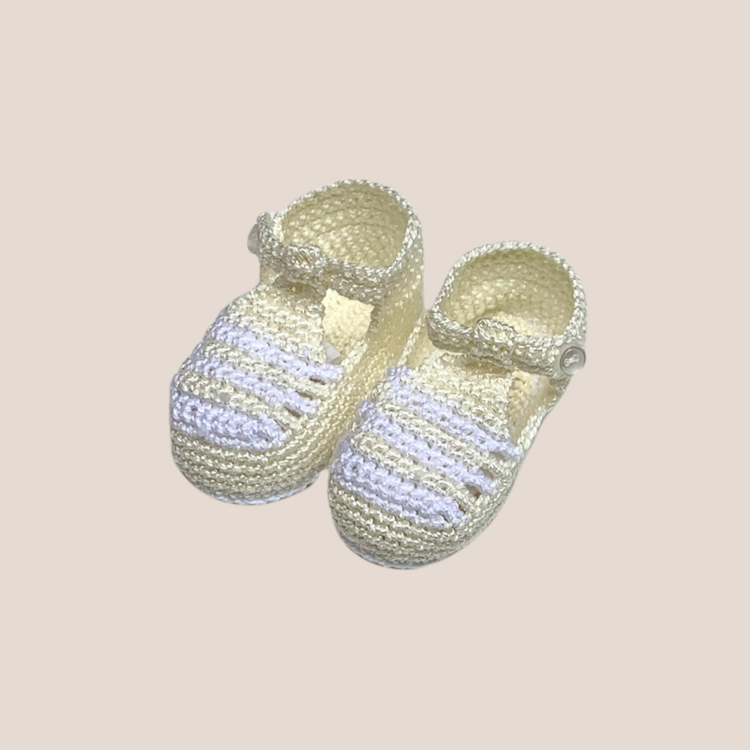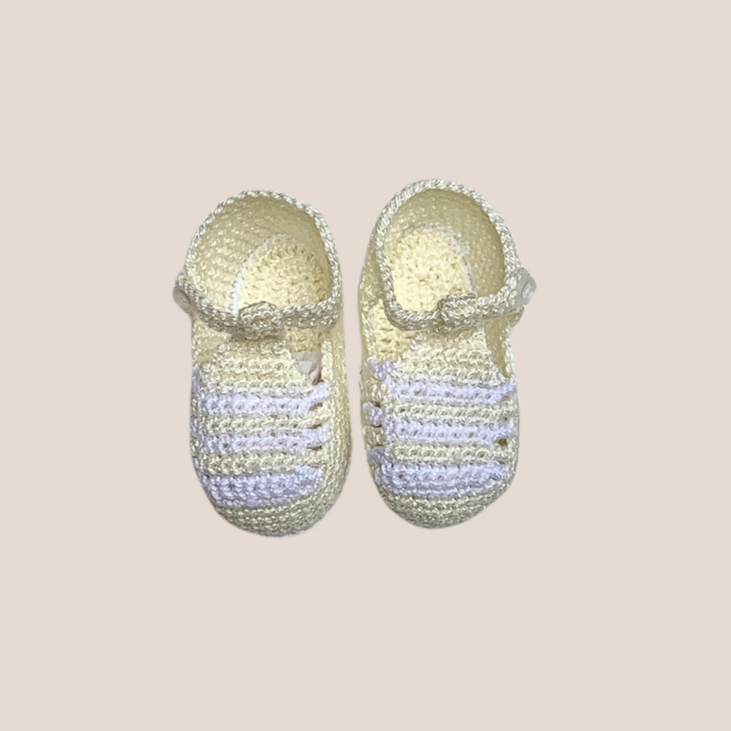 Este lindo zapatito está tejido a mano con hilo de algodón egipcio. Es un regalo perfecto para un recién nacido. El color es amarillo con pequeños detalles de color blanco.