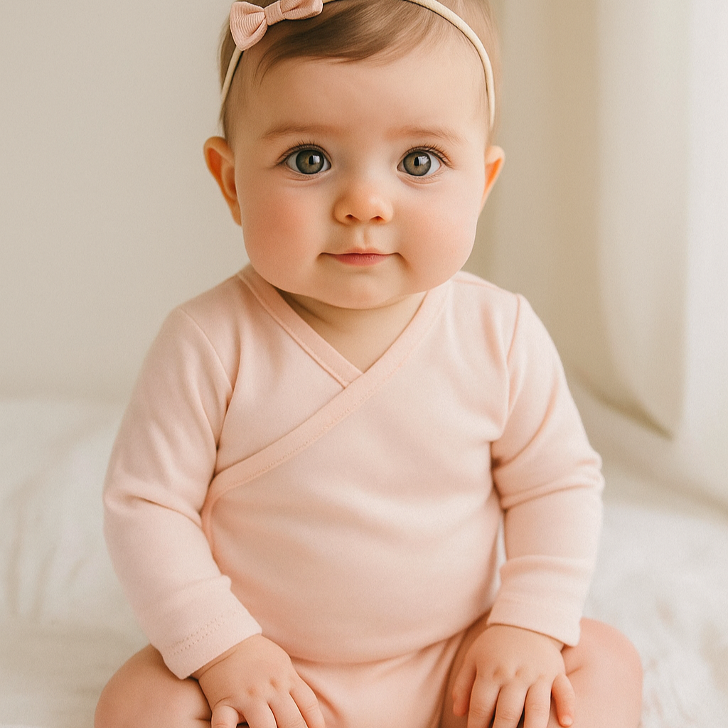 Este diseño de body Kimono se caracteriza por su apertura frontal cruzada que se abre por la parte delantera y se cruza en el pecho del bebé. Esta apertura total de cuello a tiro, facilita vestir al bebé sin tener que pasar la prenda por encima de su cabeza, facilita también el cambiado constante del pañal del bebé.