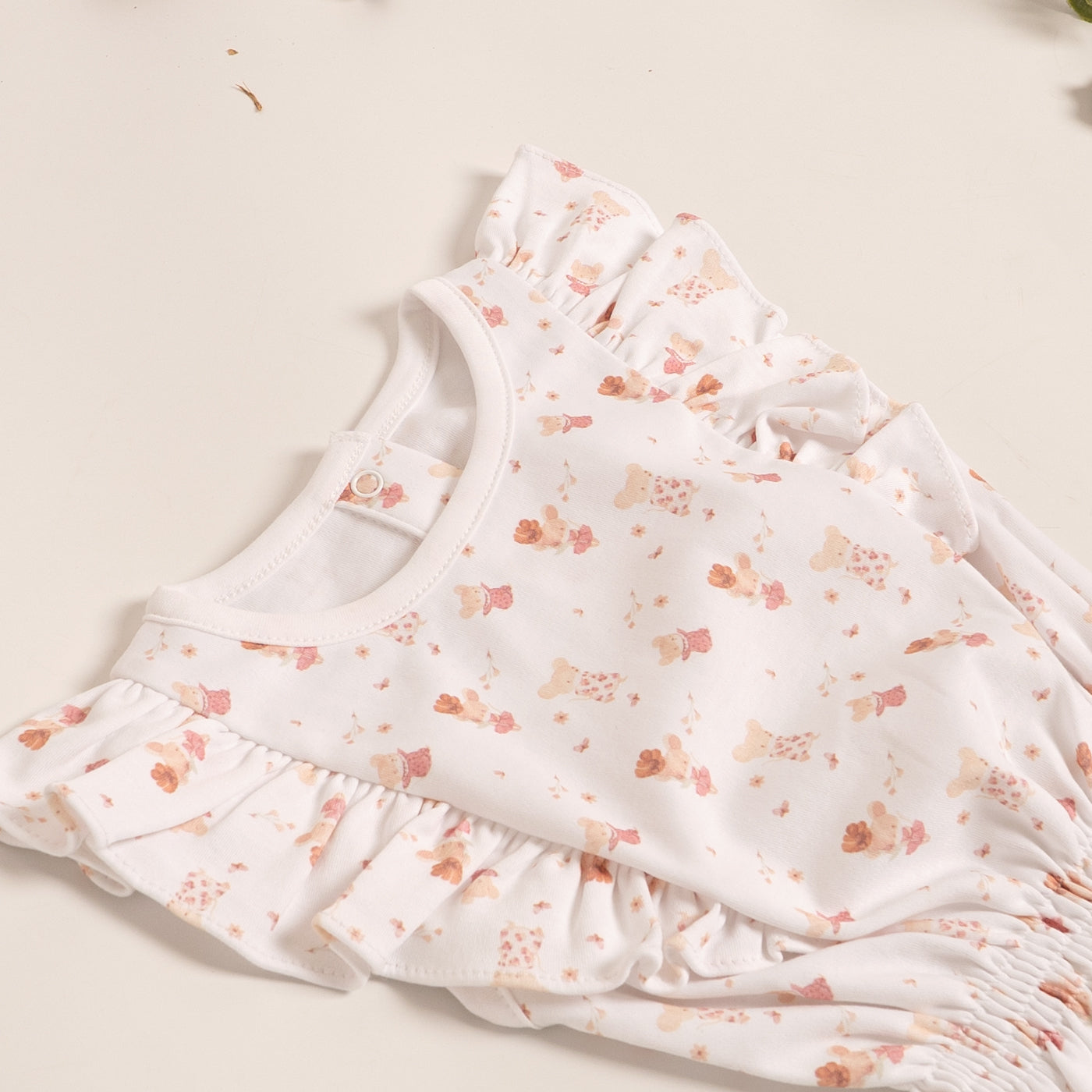 Nuestro body volantes de algodón Pima es ideal para mantener a tu bebé cómoda y protegida, su textura es suave y fresca, con un estampado simpático de ratoncitas que le dará un toque divertido a su outfit y los volantes en los hombros le agregan elegancia.