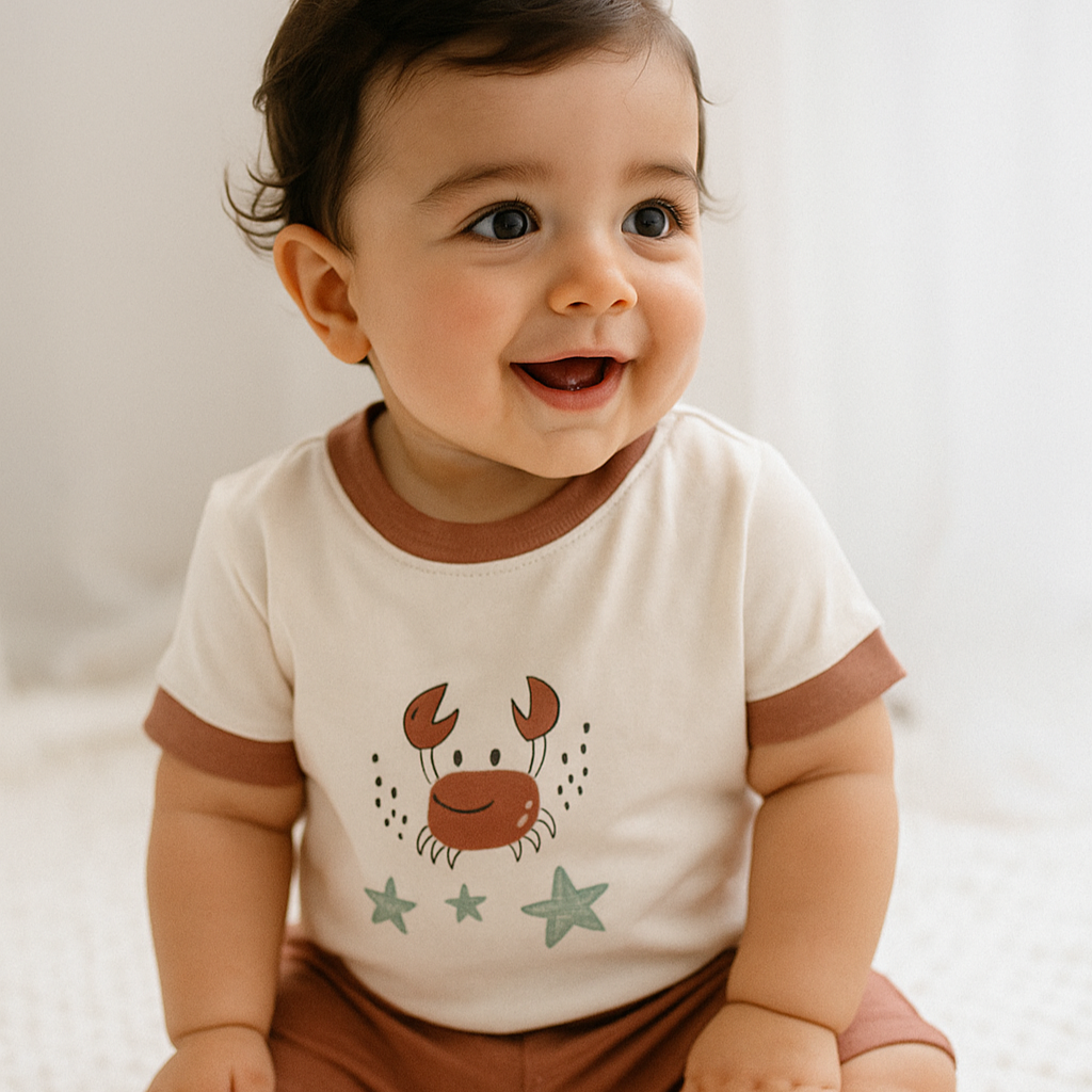El Conjunto Cangrejito está confeccionado con algodón Pima de alta calidad. El tejido es hipoalergénico, lo que lo hace perfecto para bebés con piel delicada. El estampado de cangrejito es divertido y juguetón, añadiendo un toque de personalidad a este conjunto. El diseño es fresco y ligero, perfecto para los días de calor.