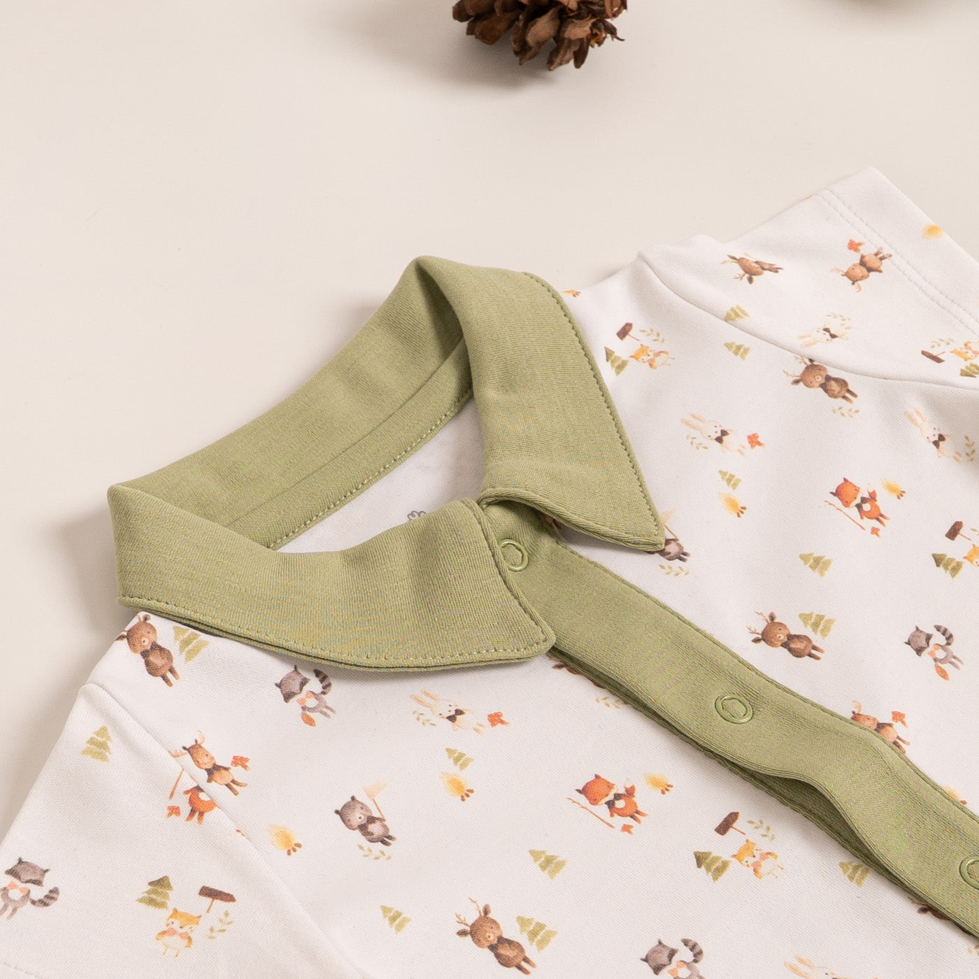Nuestro Romper Animalitos del bosque se destaca por su extrema suavidad, diseño encantador y funcionalidad. Su cuello camisero le da el toque formalito y a la vez juguetón. Tiene lindo estampado de renos renos, conejos y zorritos.